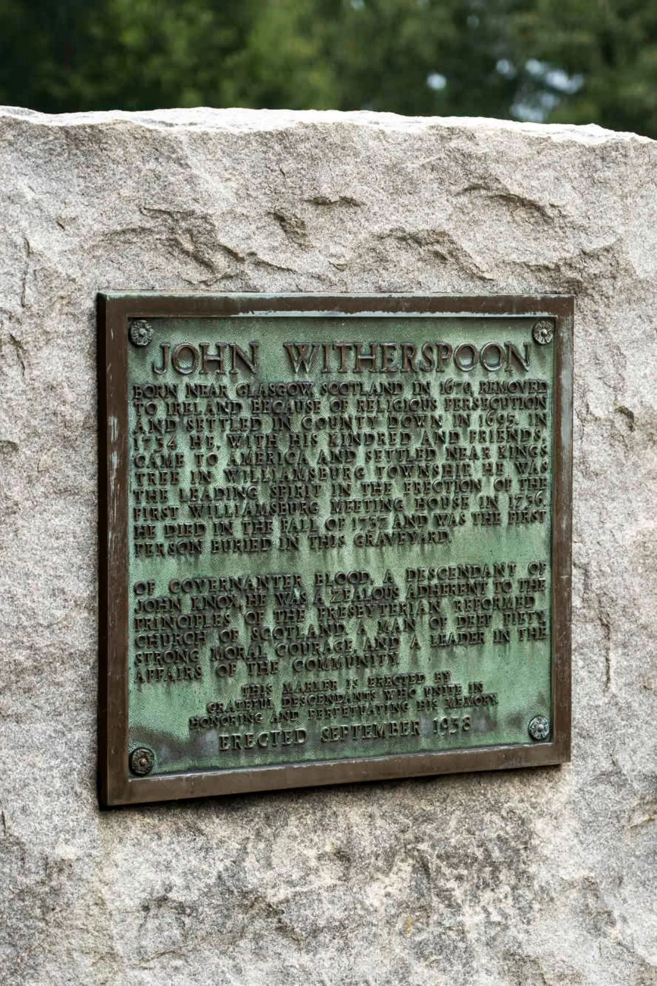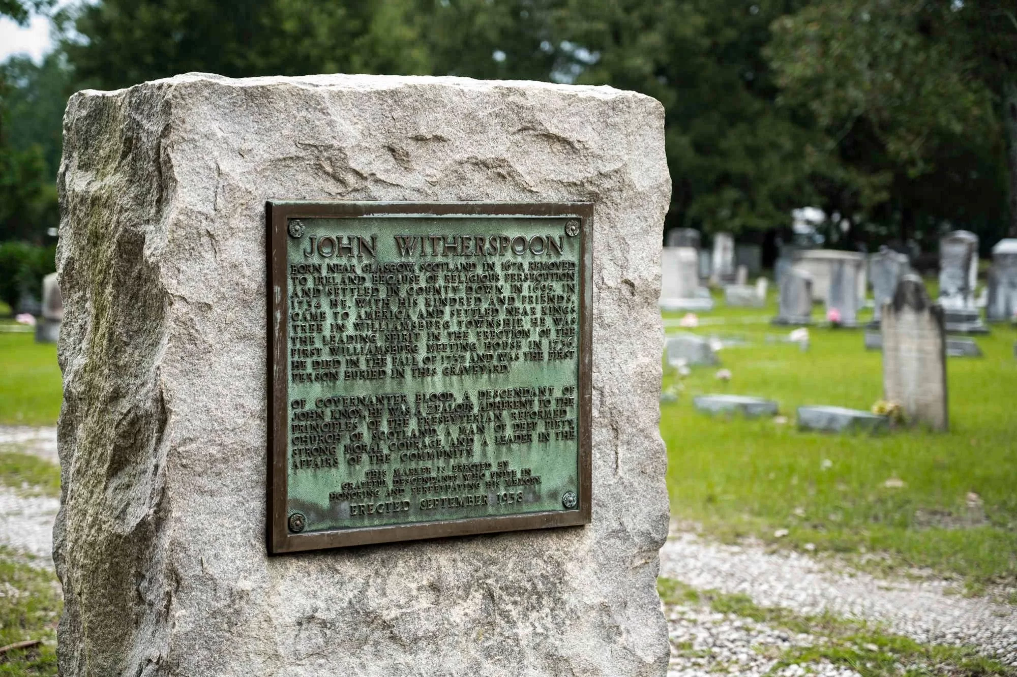 But the most notable is the gravesite of Reverend John Witherspoon. In 1695, he fled to Ireland because of religious persecution in England. In 1734, he immigrated to South Carolina, arriving in Charleston, and traveling to Williamsburg Township. He helped build the Presbyterian church for the town and died a year later. He was the first person buried in this cemetery.