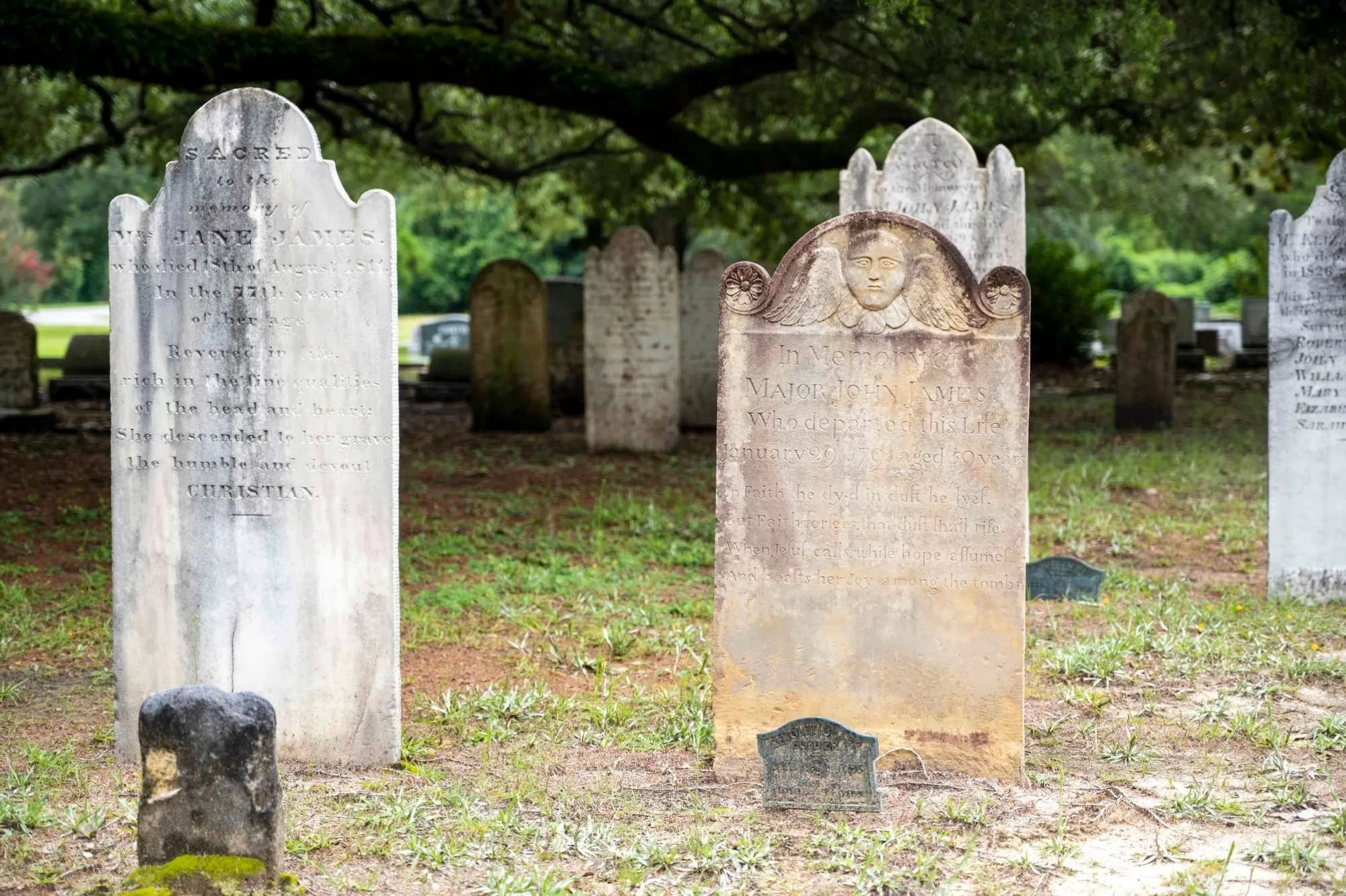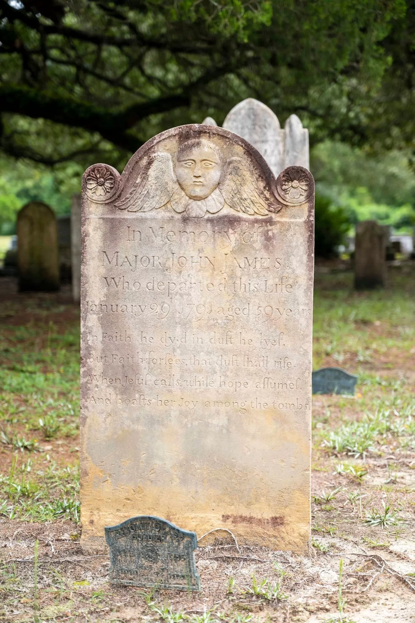 Major John James is buried in the graveyard beside the church he helped establish. His son, Captain John James, fought with him during the Revolutionary War and is buried in the graveyard.