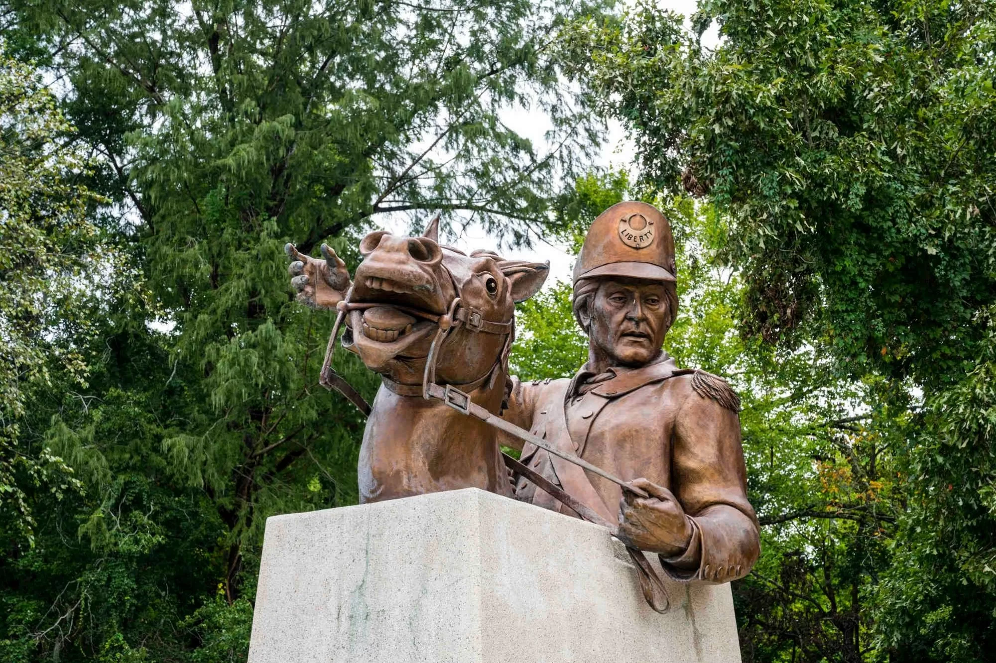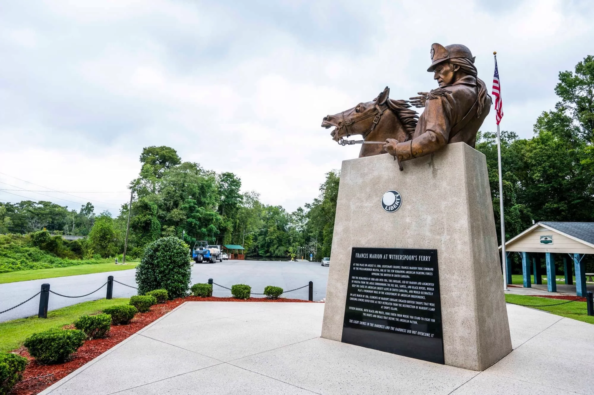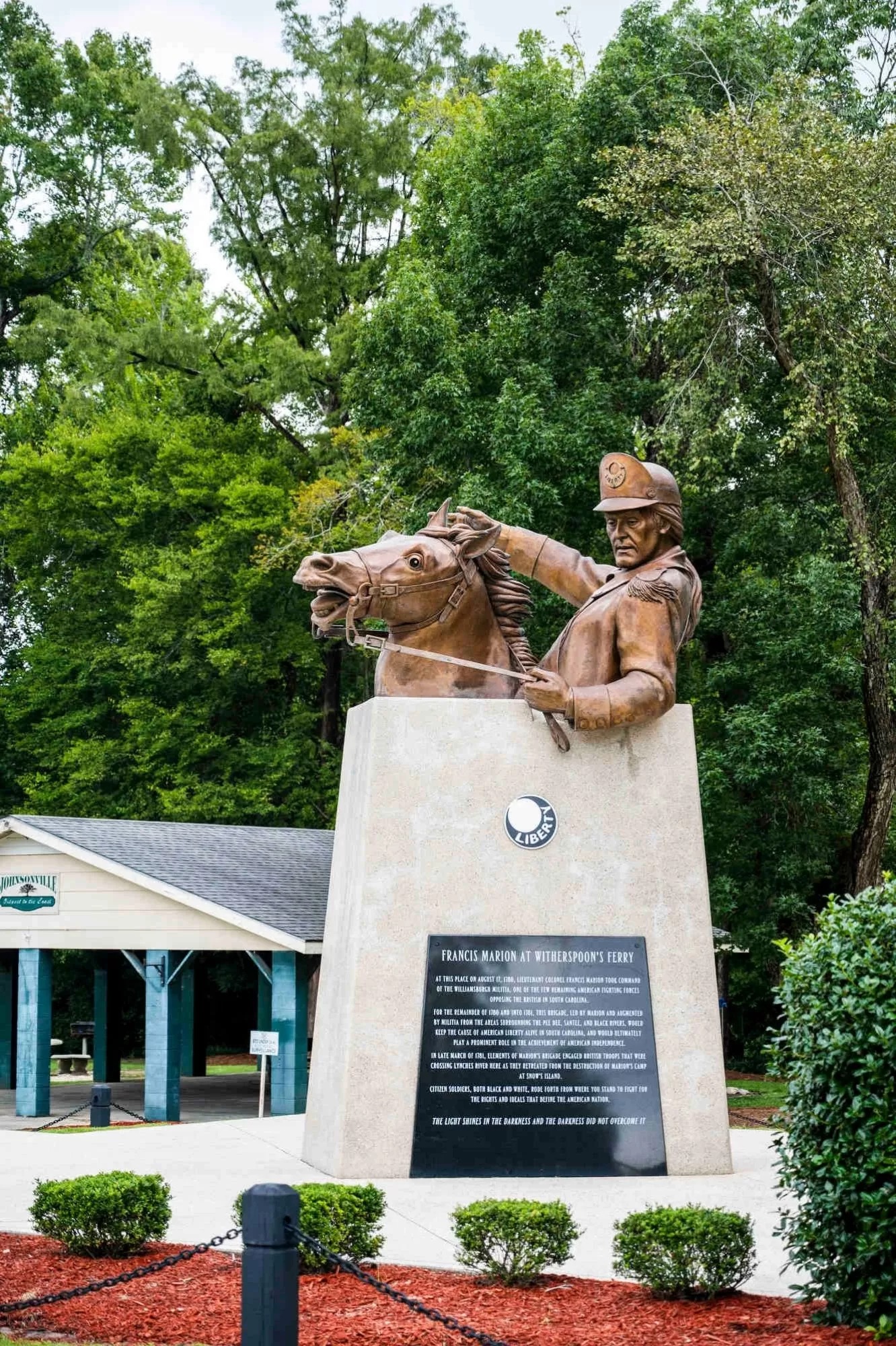 In 2013, Johnsonville dedicated a 20-foot-tall monument to Francis Marion at a small public park at the historic site of Witherspoon’s Ferry. Designed by Alex Palkovich, the monument features a bronze statue of Marion on horseback, three times larger than life, melded at the waist into a concrete base.