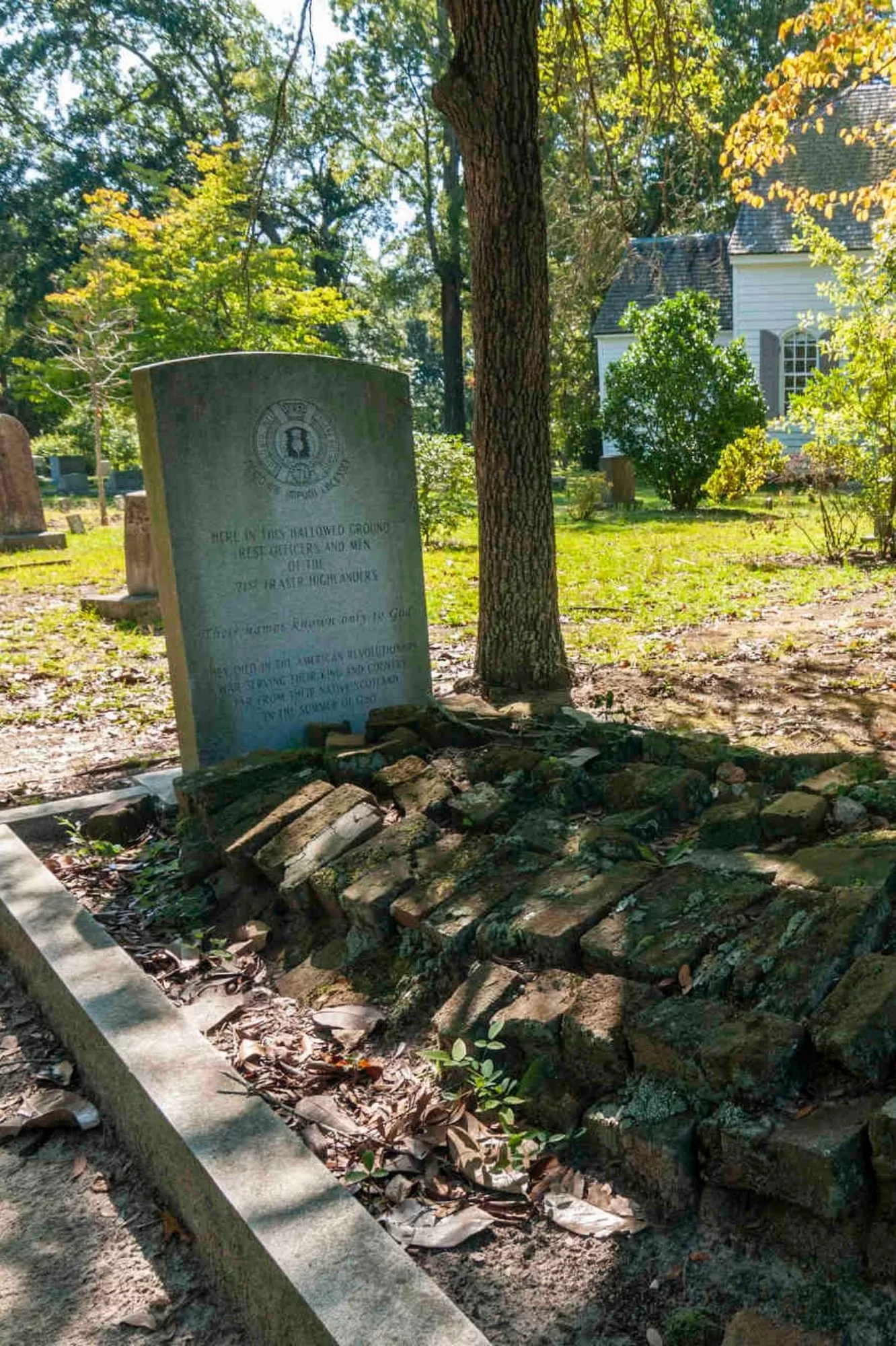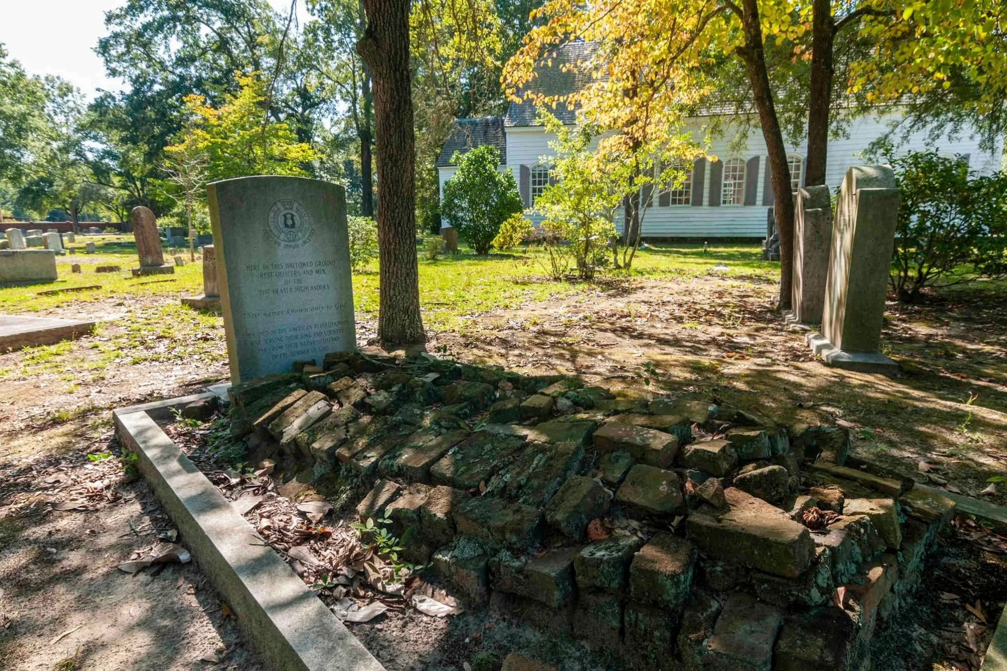 Built in 1770, Old Saint David’s Church was the last Anglican church built in South Carolina under King George III. During the Revolutionary War, Major Archibald MacArthur used the church as a field hospital when the British occupied Cheraw. One of the gravesites is marked with a headstone that reads, “Here in this hallowed ground rest officers and men of the 71st Fraser Highlanders.”