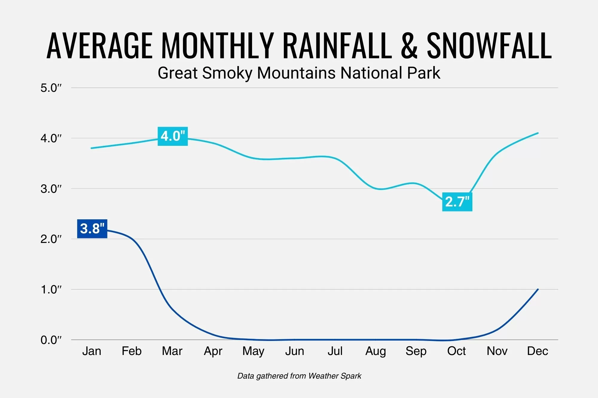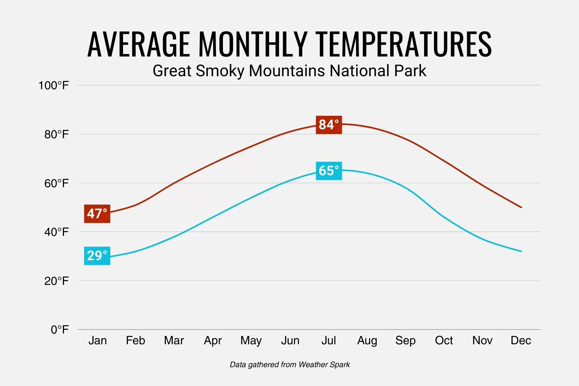 The chart above shows the average monthly temperatures for the lower elevations of the Great Smoky Mountains National Park. Places like Cades Cove, Roaring Fork Motor Nature Trail, Oconaluftee, and Cataloochee Valley.