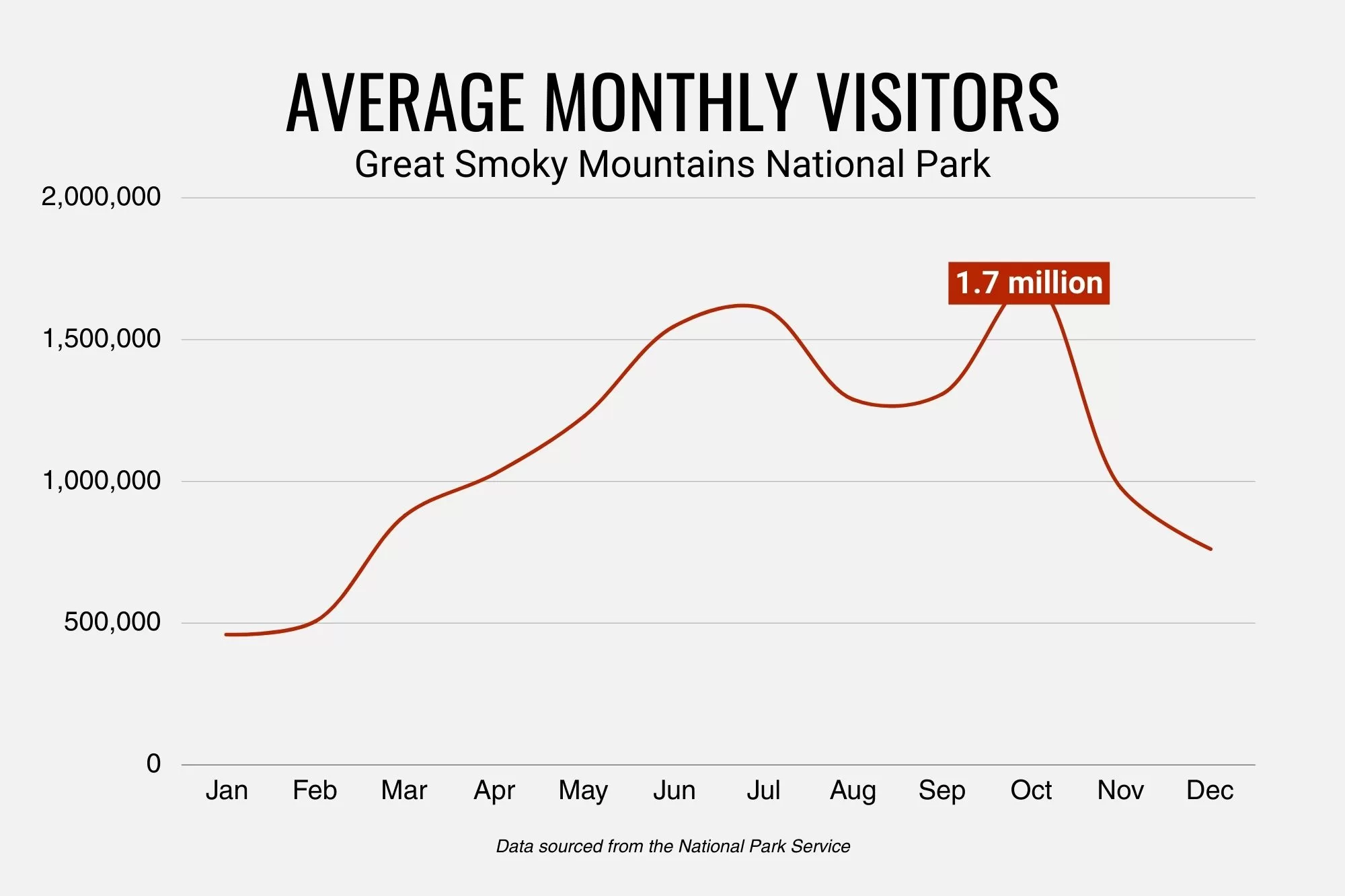 September is a shoulder month in the Great Smoky Mountains National Park, making it one of the best times to visit for smaller crowds. After peaking with an average of 1.6 million monthly visitors in July, the number drops to about 1 million by September. It’s more crowded than the spring months but not as crowded as July or October.
