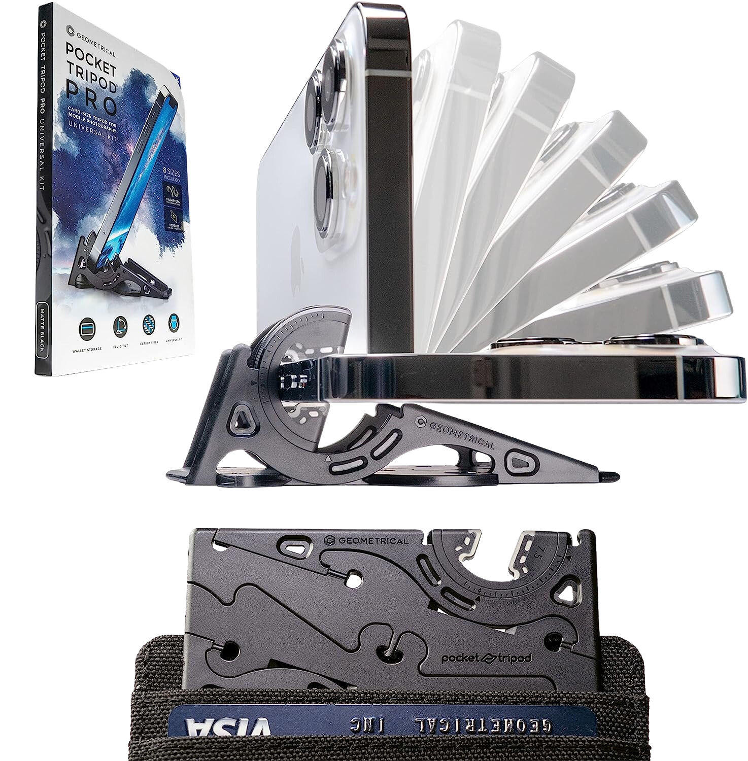 In a world consumed by smartphones, the Pocket Tripod is a much-needed accessory that fits into your wallet or purse. The credit card-sized tripod folds and twists into a tripod for tabletop use. A set of adapters creates the perfect fit for many smartphones with cases. The carbon fiber material makes the Pocket Tripod durable for travel and use.
