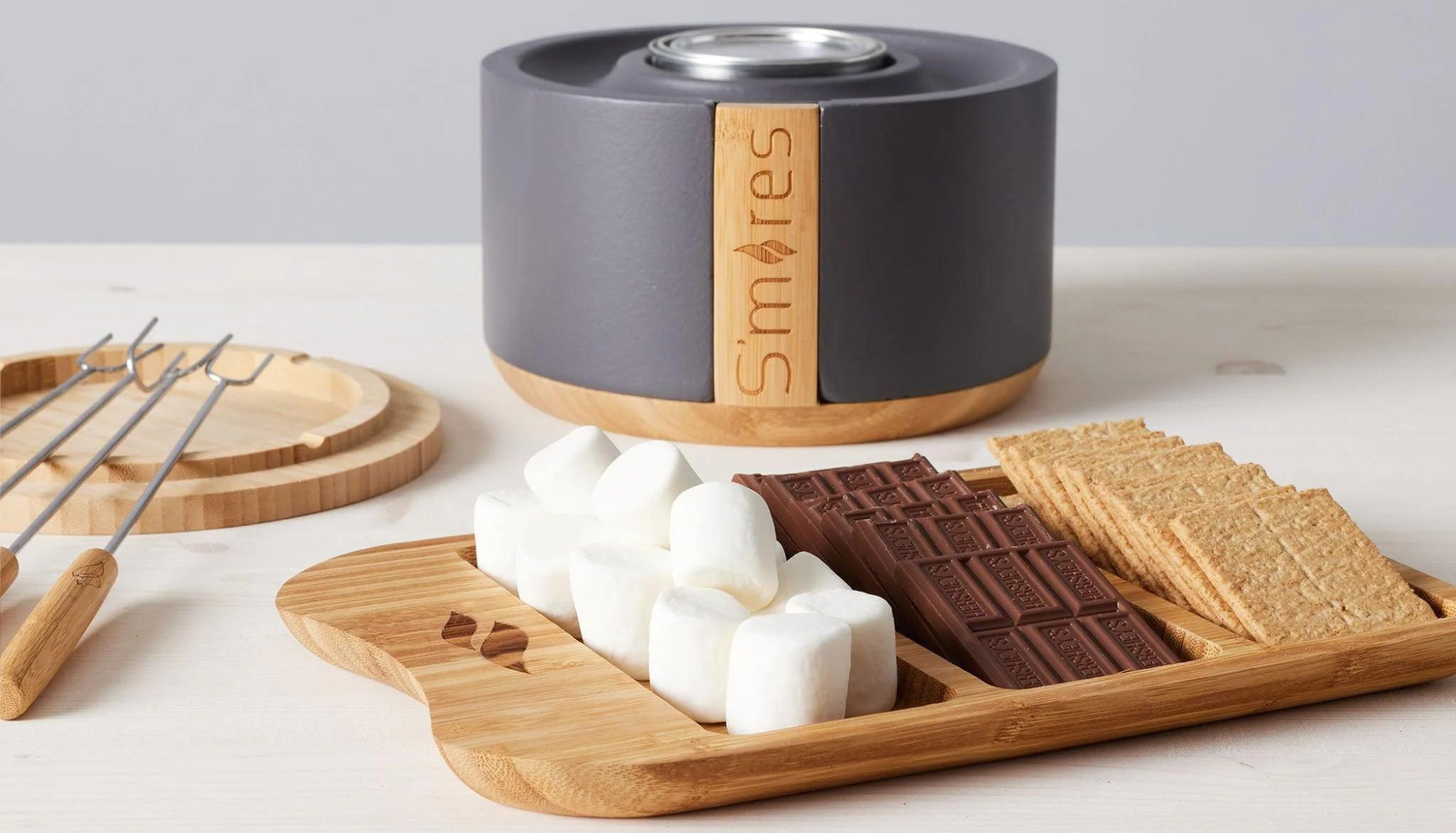 The TerraFlame S’Mores Tabletop Fire Bowl uses a smoke-free, clean-burning gel fuel that makes it safe to use indoors. The kit includes a bamboo s’mores tray for laying out the ingredients and skewers for roasting marshmallows. What’s your favorite s’mores recipe?