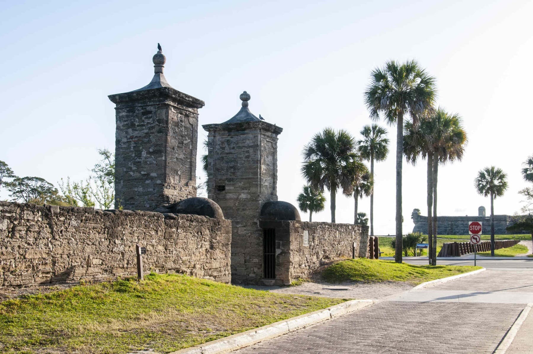 This is the only remaining part of the original gate leading into St. Augustine. In the distance on the right side is the Castillo de San Marcos National Monument.