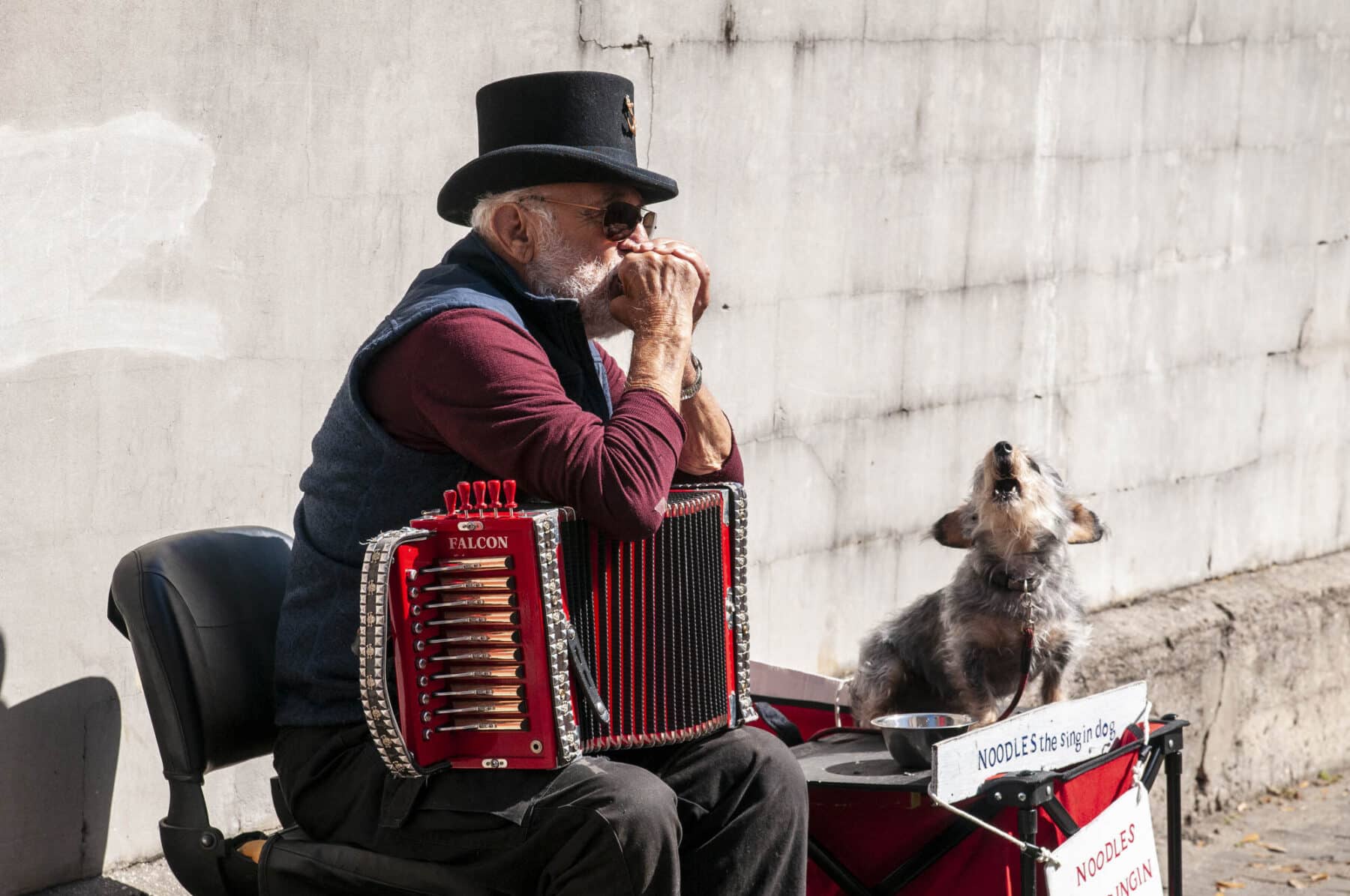 This is Noodles. He is professional known as The Singing Dog. Several times a week, Noodles brings his human out to St. George Street to entertain the visitors.