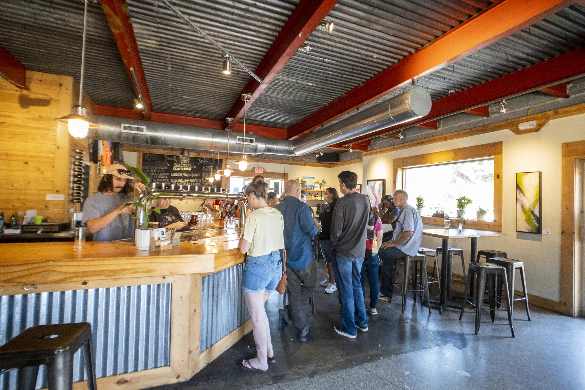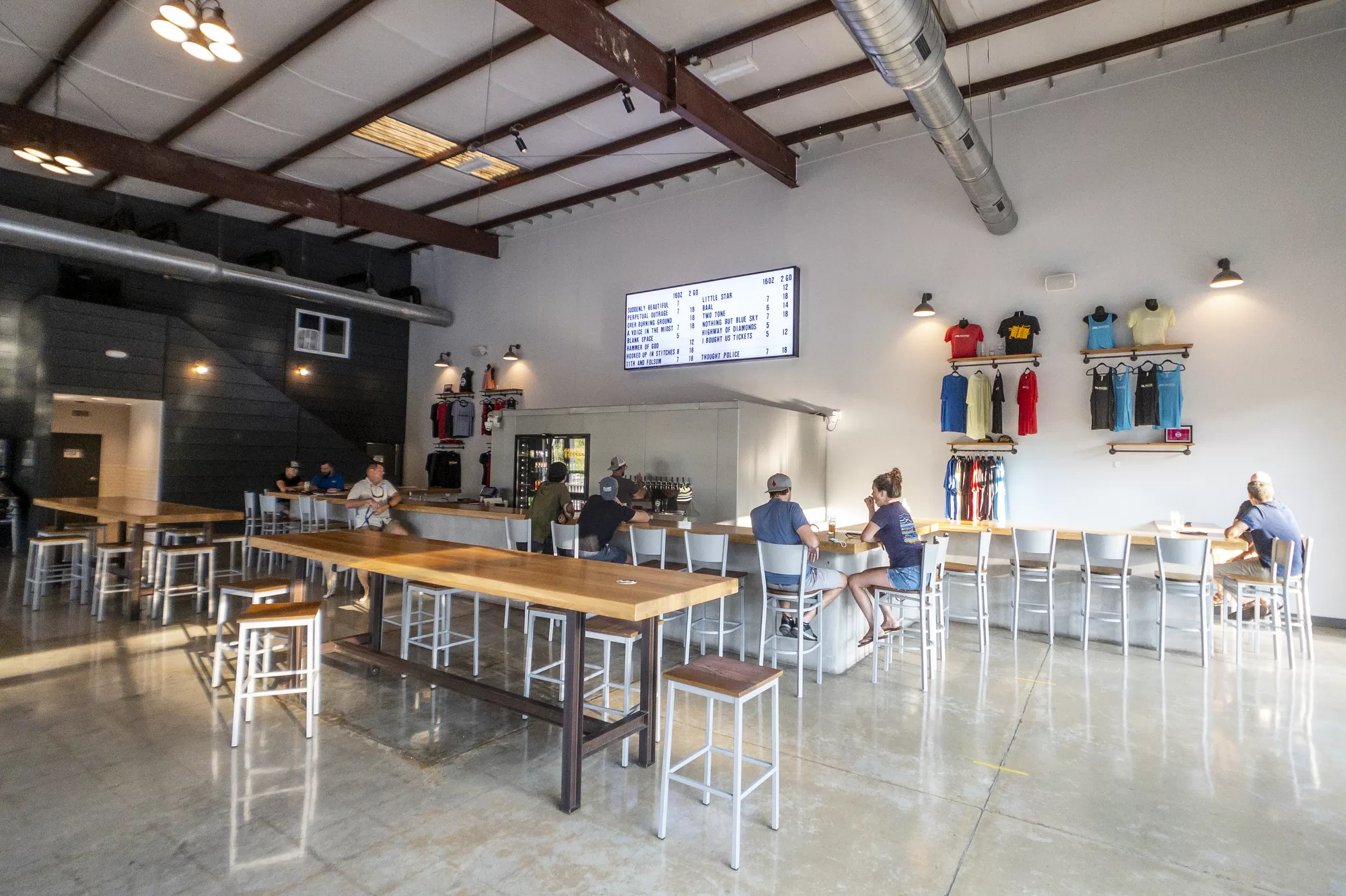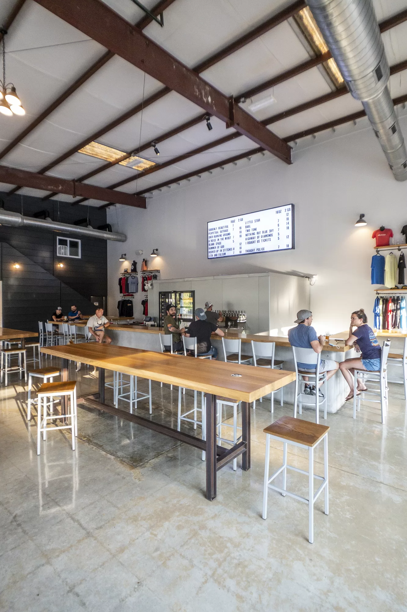 The front quarter of the building features painted concrete floors, vaulting ceilings, and large windows flooding the space with daylight. Visitors can sit at high-top tables or at the bar while they sample the craft beers. The folks at New Anthem aren’t afraid to experiment, and it’s impossible to peg them to just one type of beer.