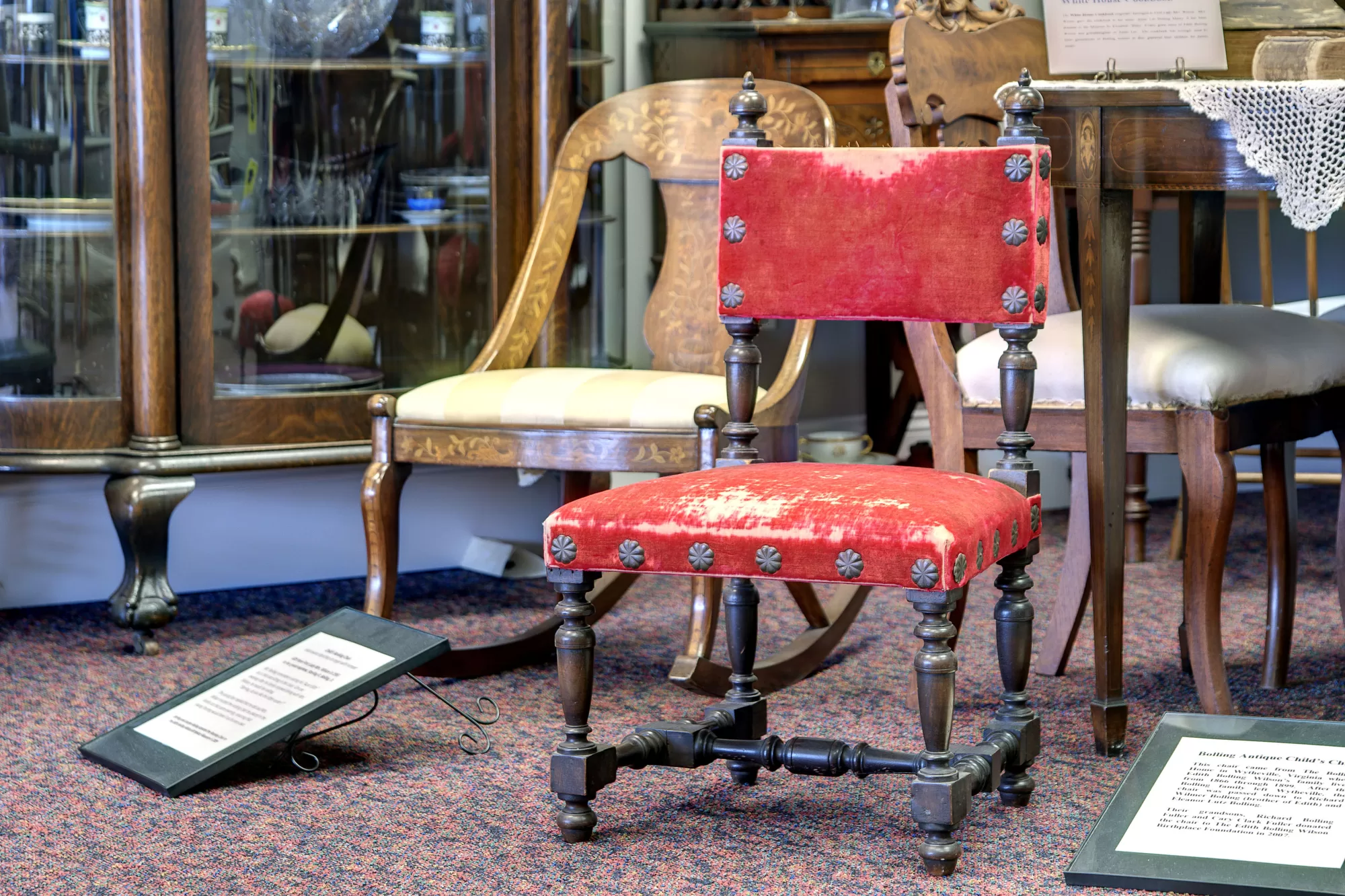 The exhibits include items like the Wilson family Bible, a signature stamp, and letters written by Edith Bolling Wilson. One curious item was a vibrant red wooden chair – this was Edith’s childhood chair! A ten-minute orientation film introduces visitors to Edith’s childhood in Wytheville and life as First Lady.