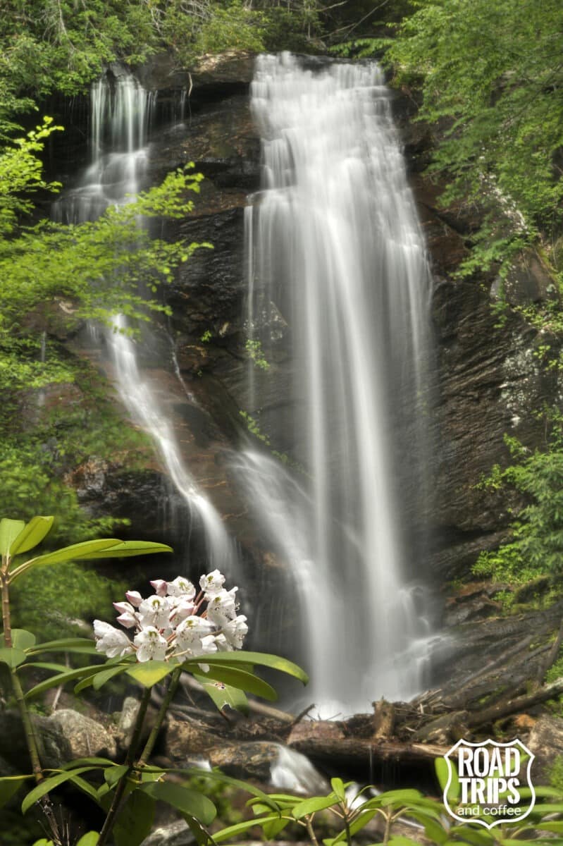Anna Ruby Falls is two waterfalls. On the left, the cascading waterfall from Curtis Creek is 153 feet tall. On the right, the freefalling waterfall from York Creek is 50 feet tall.