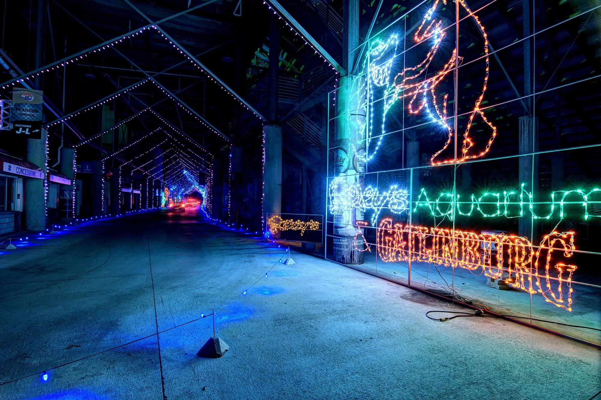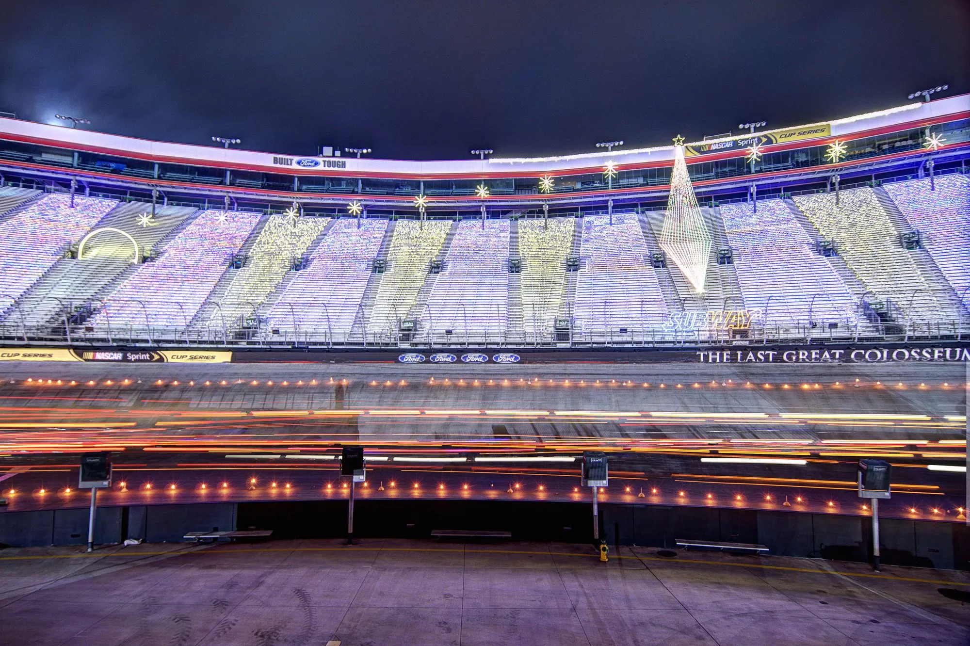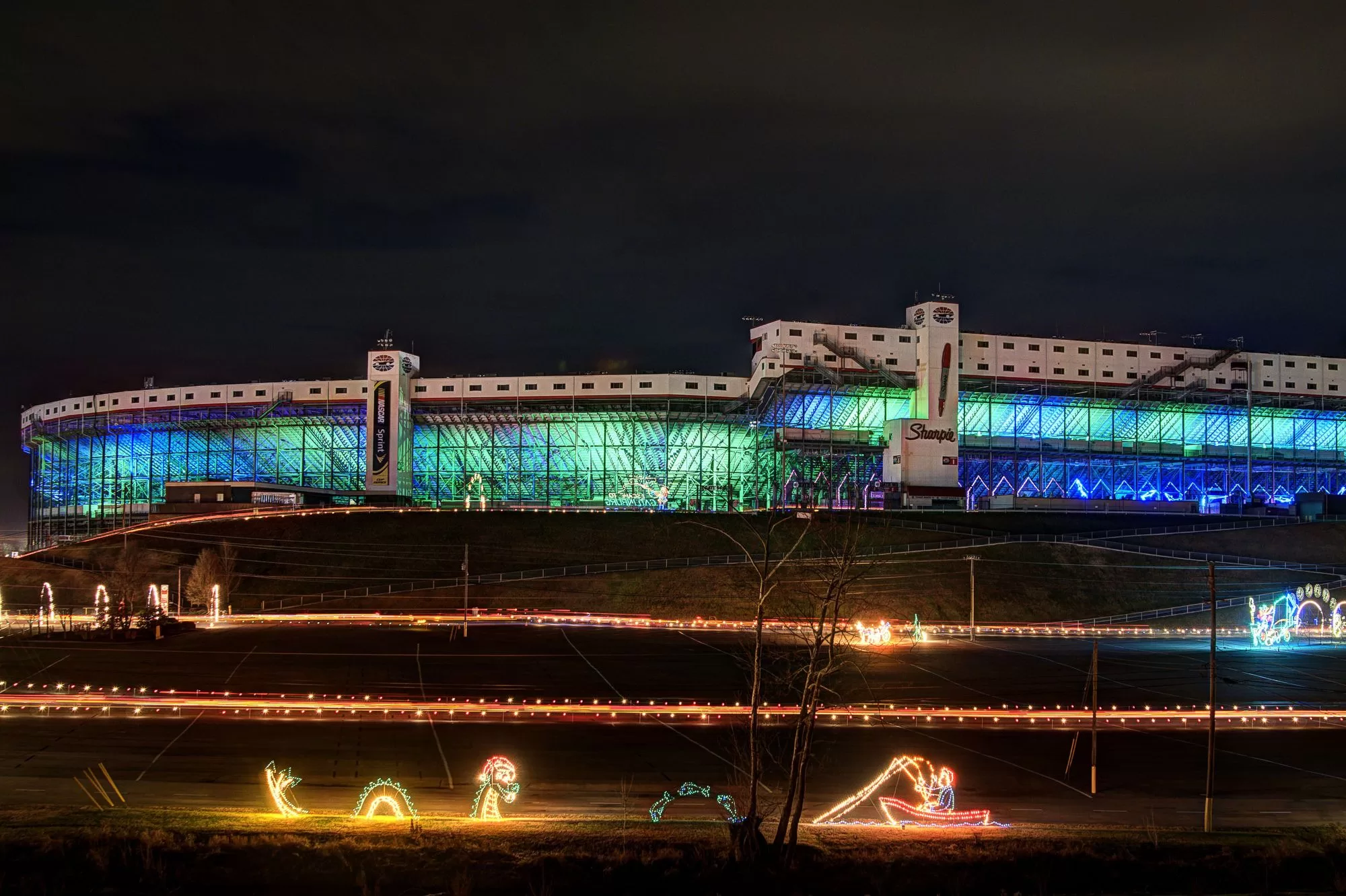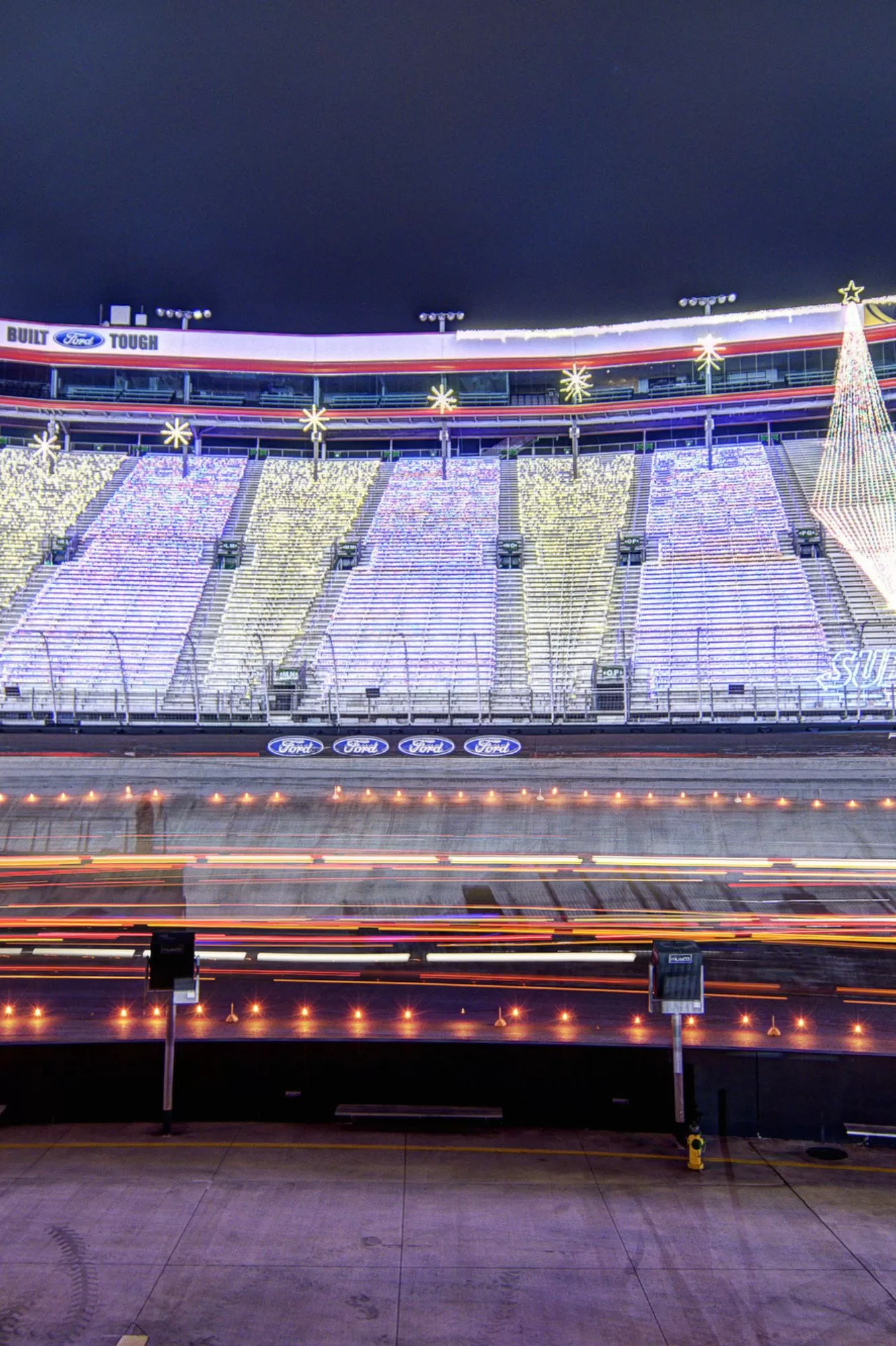 The popular Symphony in Lights is best viewed with a slow lap around the “World’s Fastest Half-Mile.” 300,000 lights spread across the Darrell Waltrip Grandstands pulse in tune to popular holiday music played across the speedway’s public address system.