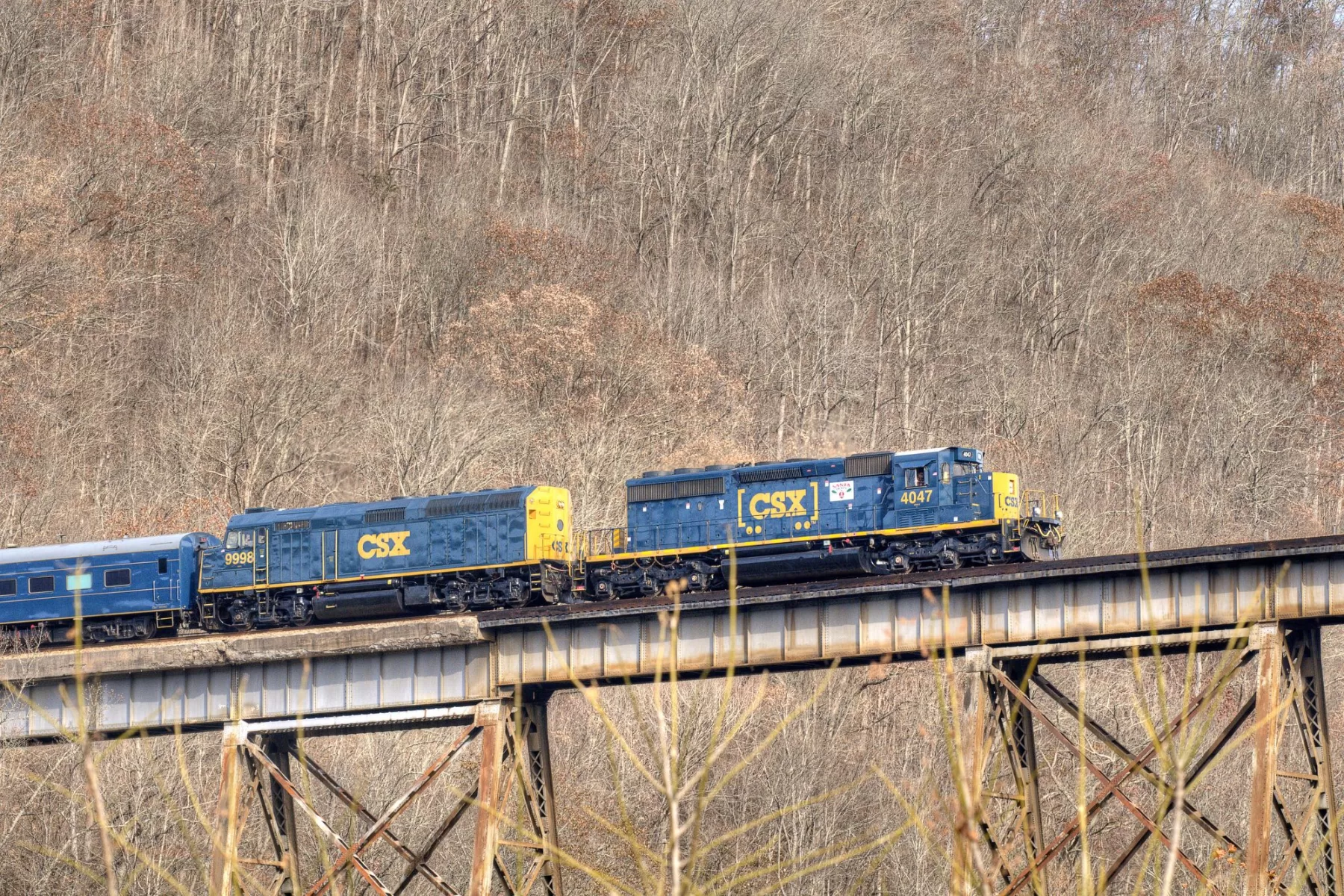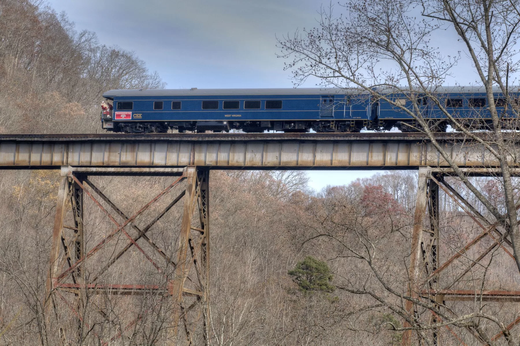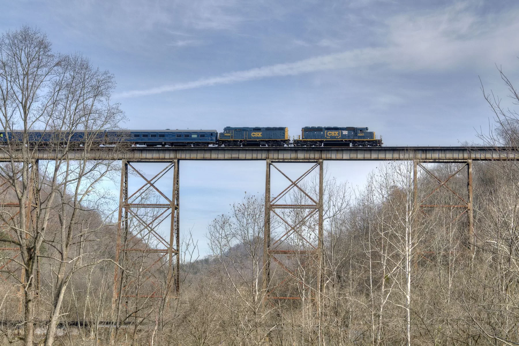 The best view of the CSX Santa Train is from an overgrown scenic overlook along U.S. Highway 23 in Duffield. After the train passes through a tunnel, it crosses the impressive Copper Creek Viaduct. Built in 1908, the trestle is 167 feet above the Clinch River and spans 1,091 feet.