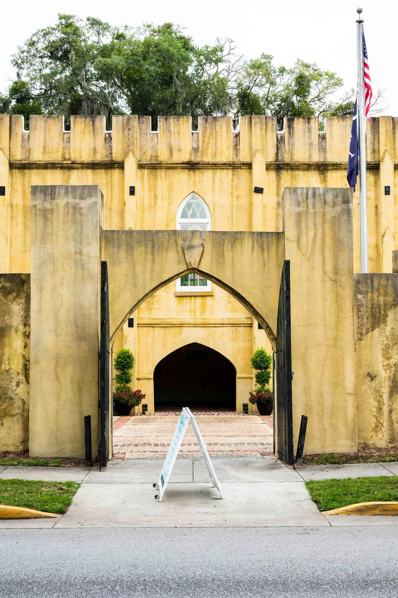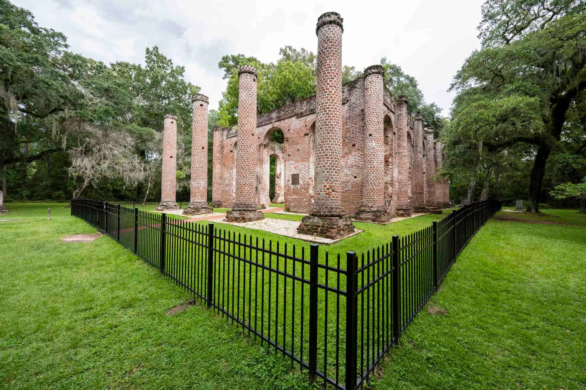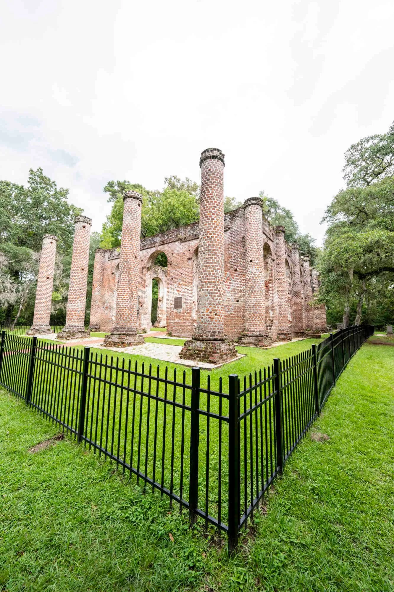 A black cast iron fence, about 2′ tall, was recently installed around the ruins to prevent curious visitors from climbing the ruins. Except “ruins” is a word that almost doesn’t seem to apply. The towering brick columns and exterior walls reach almost as high as the surrounding oak trees. They are amazingly intact and wonderfully gorgeous.