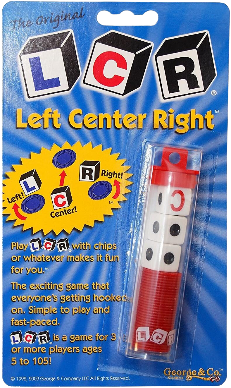 Left-Center-Right is an entertaining dice game that fits into your pocket – all you need is a stack of dollar bills to play.