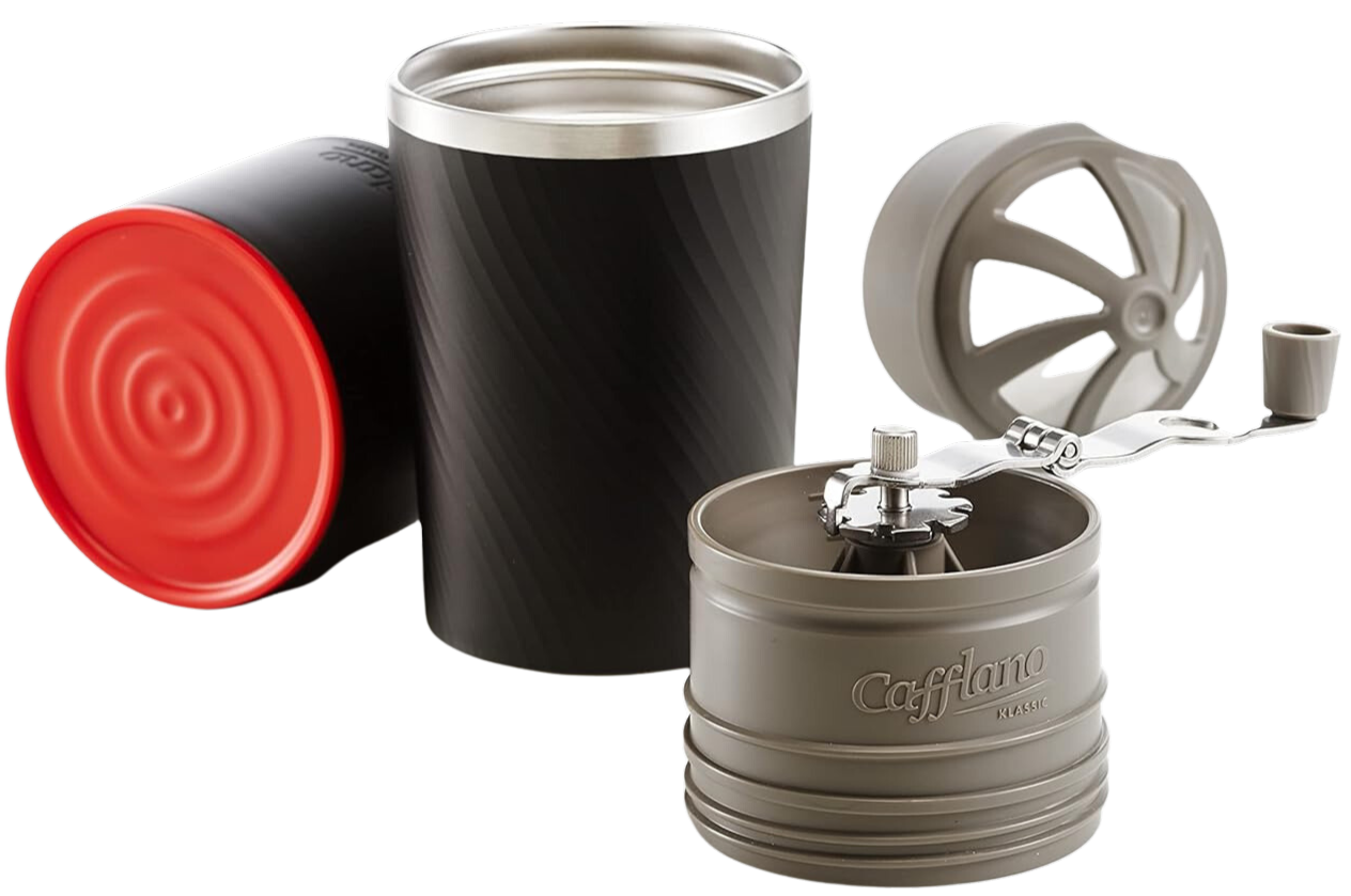 The Cafflano Klassic All-in-One Pour Over Coffee Maker is one of the most innovative coffee machines ever produced. The nifty device features a kettle, conical burr grinder, pour-over filter, and a coffee mug that assembles into a 7.6″x3.5″ travel container. And weighing just one pound, it’s easy to pack for travel.