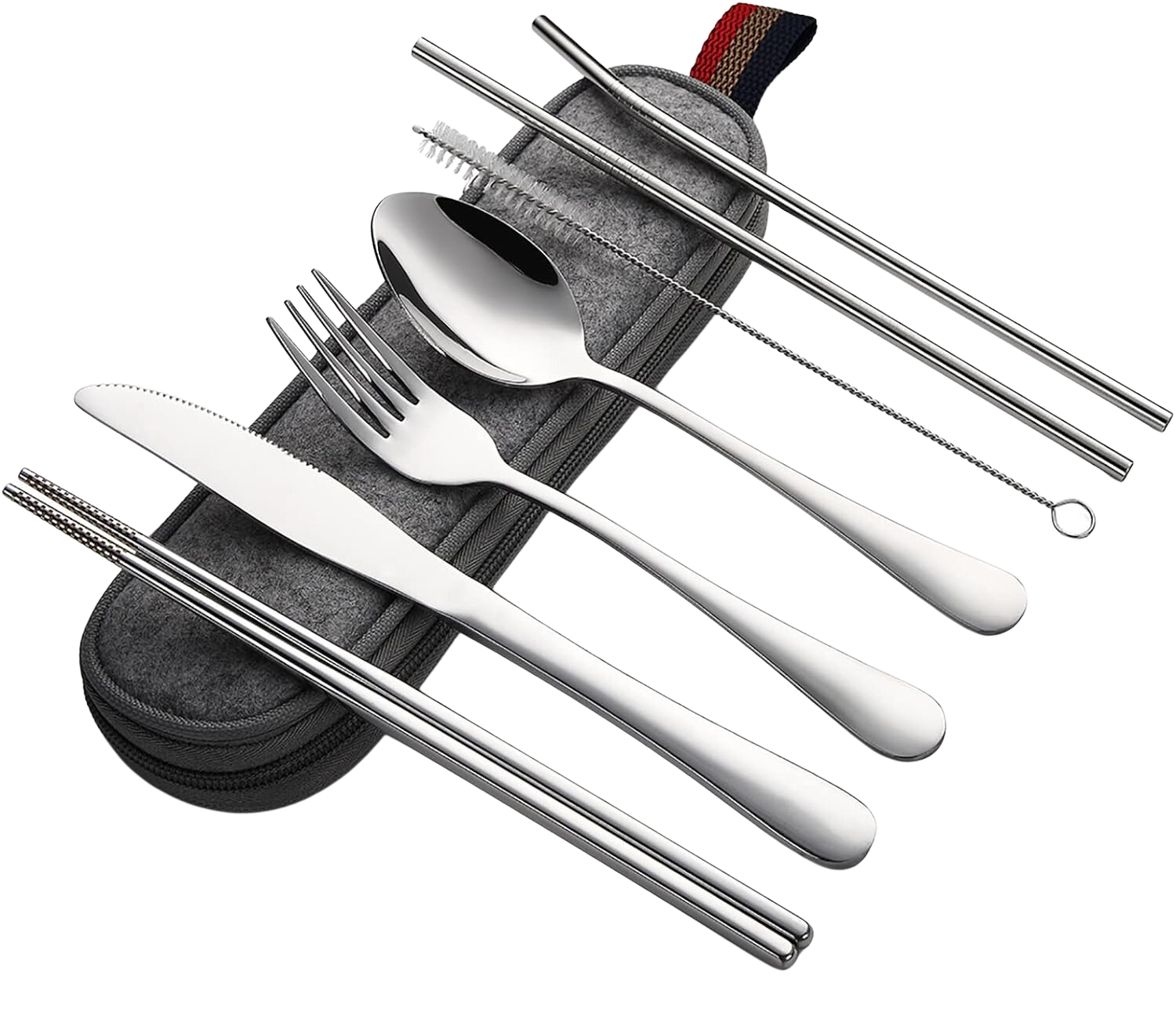 Inside the durable zippered case, you’ll find a set of stainless steel utensils, including a fork, spoon, knife, straight straw, bent straw, straw cleaning brush, and chopsticks. It’s everything you need for any meal in a convenient carry case.
