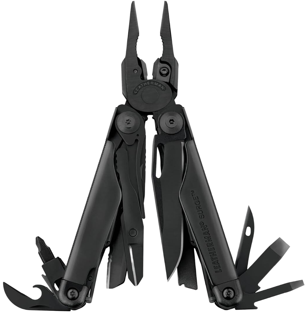 The Leatherman Surge Multitool features 21 tools in one compact body. The tools include pliers, wire cutters, a knife, a saw blade, spring-action scissors, a can and bottle opener, and a bit driver. The multitool comes with a convenient carry case with a belt loop.