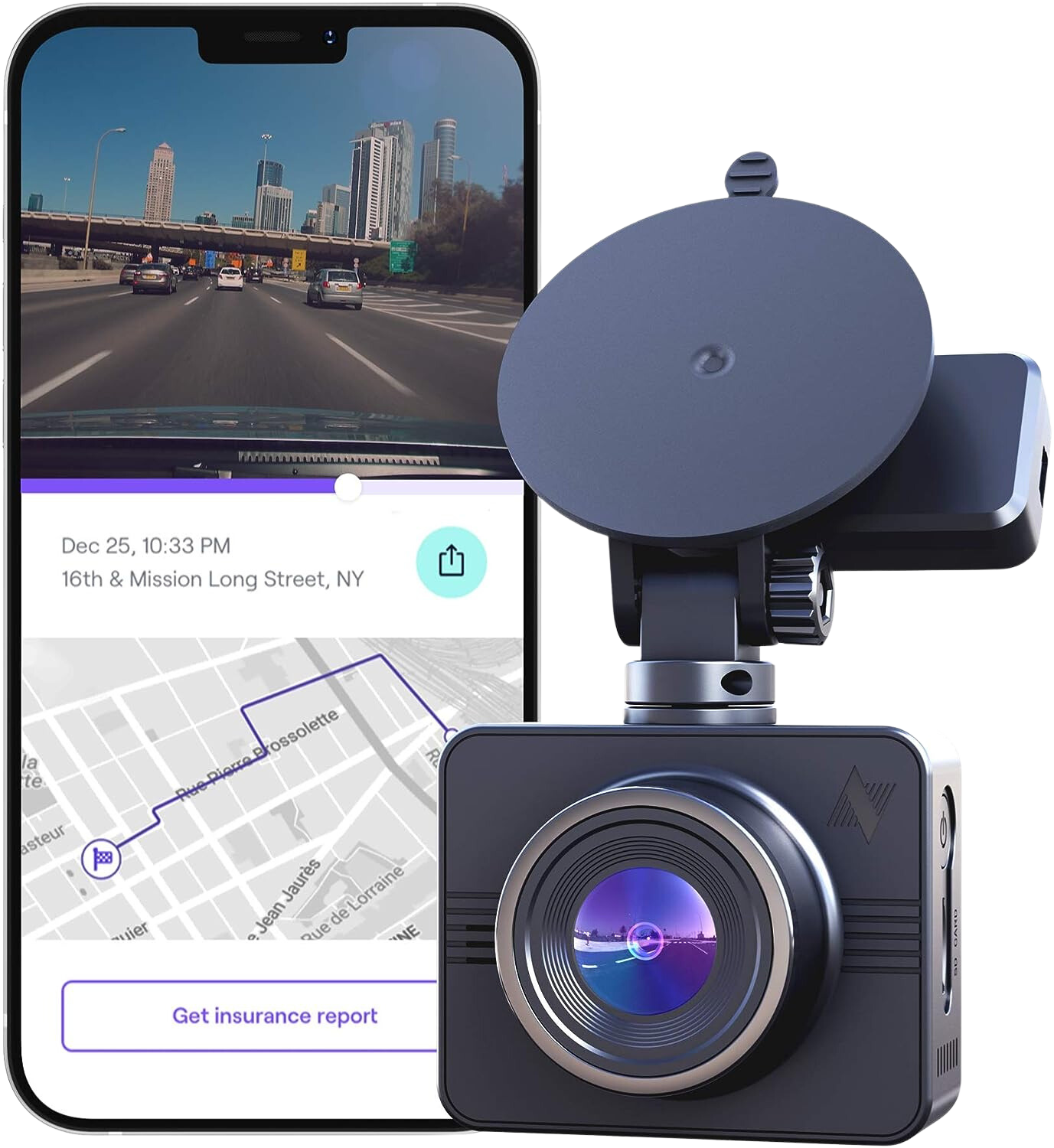 The front-facing dash cam includes a 3-inch touchscreen for changing settings, saving clips, and monitoring the recorded footage. With a smartphone app connected via Wi-Fi, users can watch clips saved to the dash cam’s memory card, download clips, and change settings. As long as a smartphone is connected to the dash cam, the device can send an SOS to local emergency services during a collision.