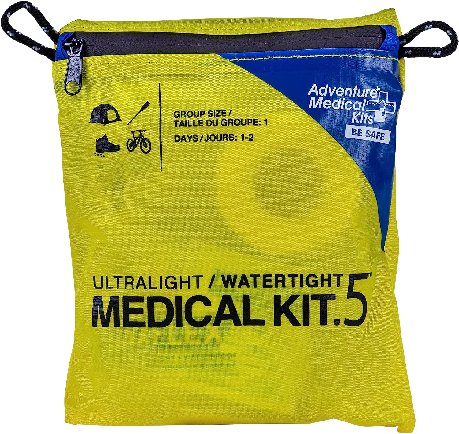 The Adventure Medical Kit .5 is the smallest of their lineup. The kit contains butterfly bandages, gauze bandages, tape, antiseptic wipe, Ibuprofen, Aspirin, moleskin, and tweezers. And there is just enough room inside the bag to add some items.