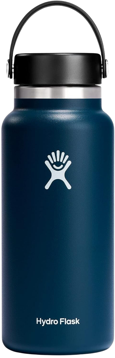 My favorite is the Hydro Flask Wide Mouth Bottle with Flex Cap. When properly secured, The cap is leakproof, and the attached carrying strap is comfortable for long distances. The cap quickly unscrews, allowing you to thirstily gulp the water through the wide mouth that’s about 75% the width of the bottle.