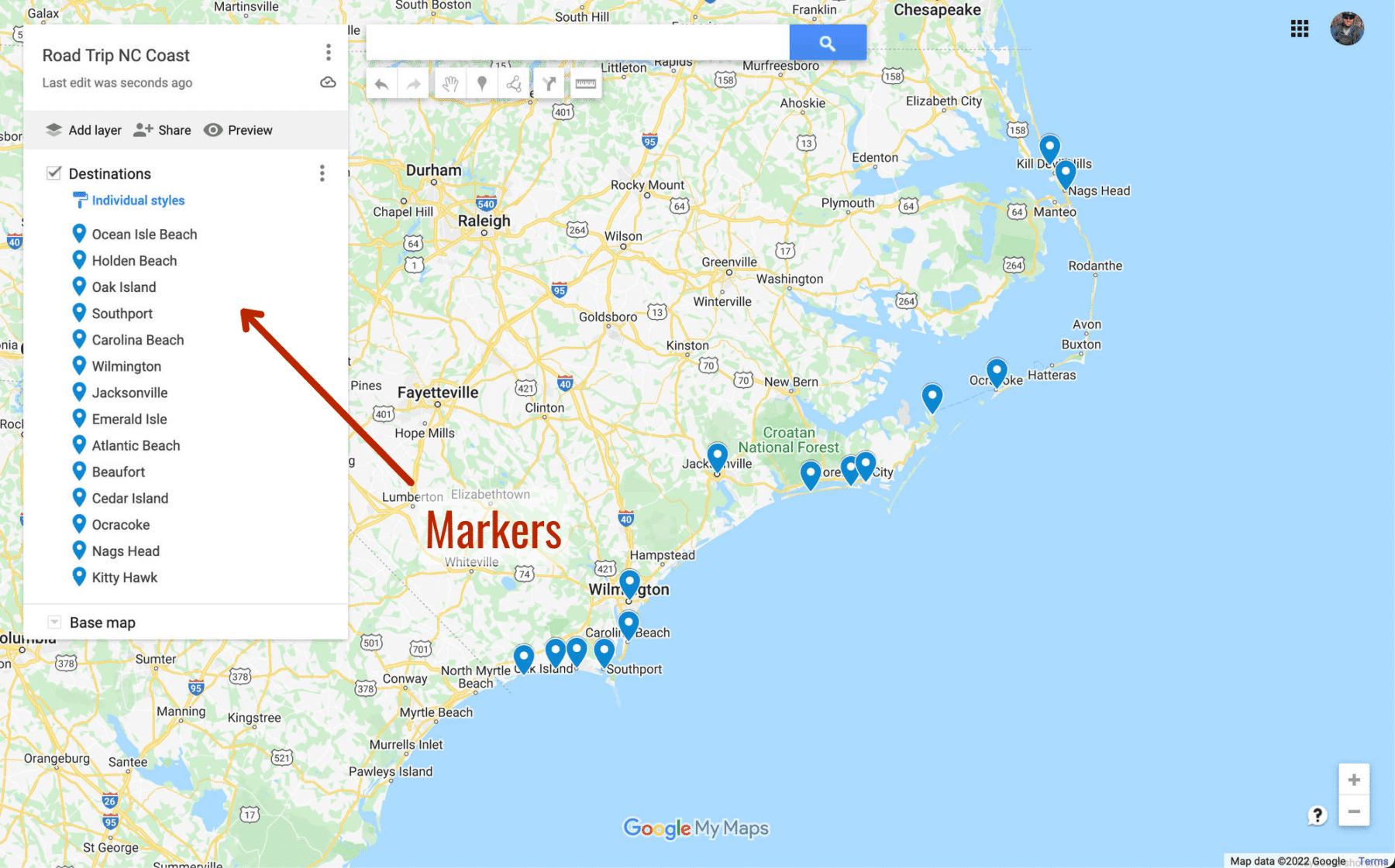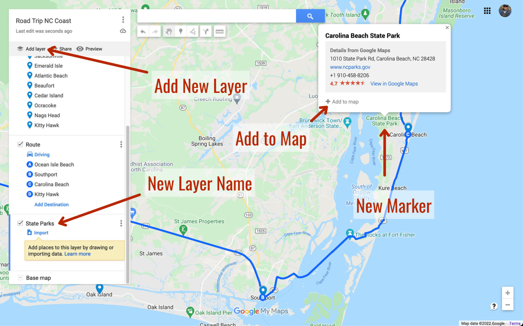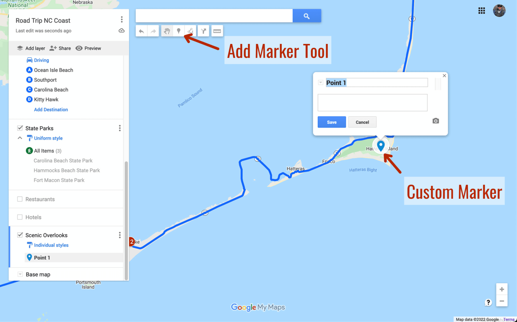 With the route finished, now comes the fun part. Adding the markers! Layers and markers are a good way to visualize your road trip adventure, adding places you don’t want to miss and roadside attractions you need to visit.