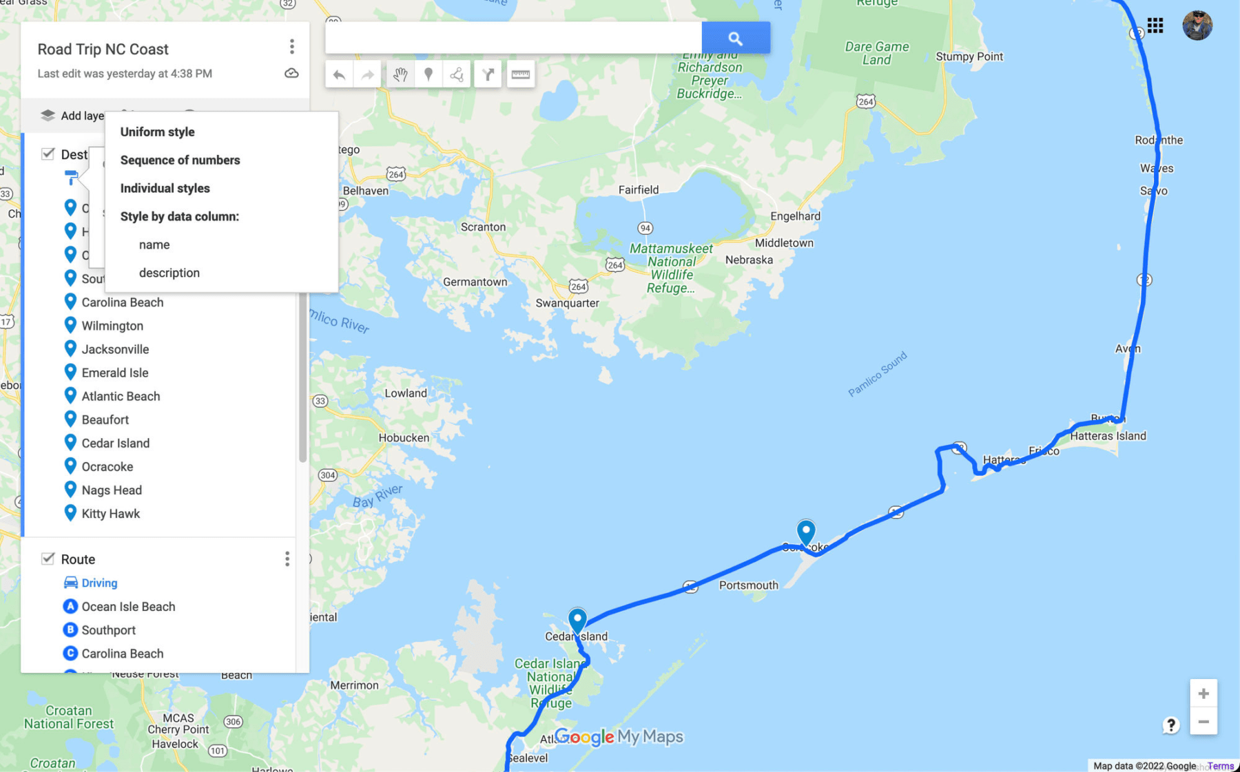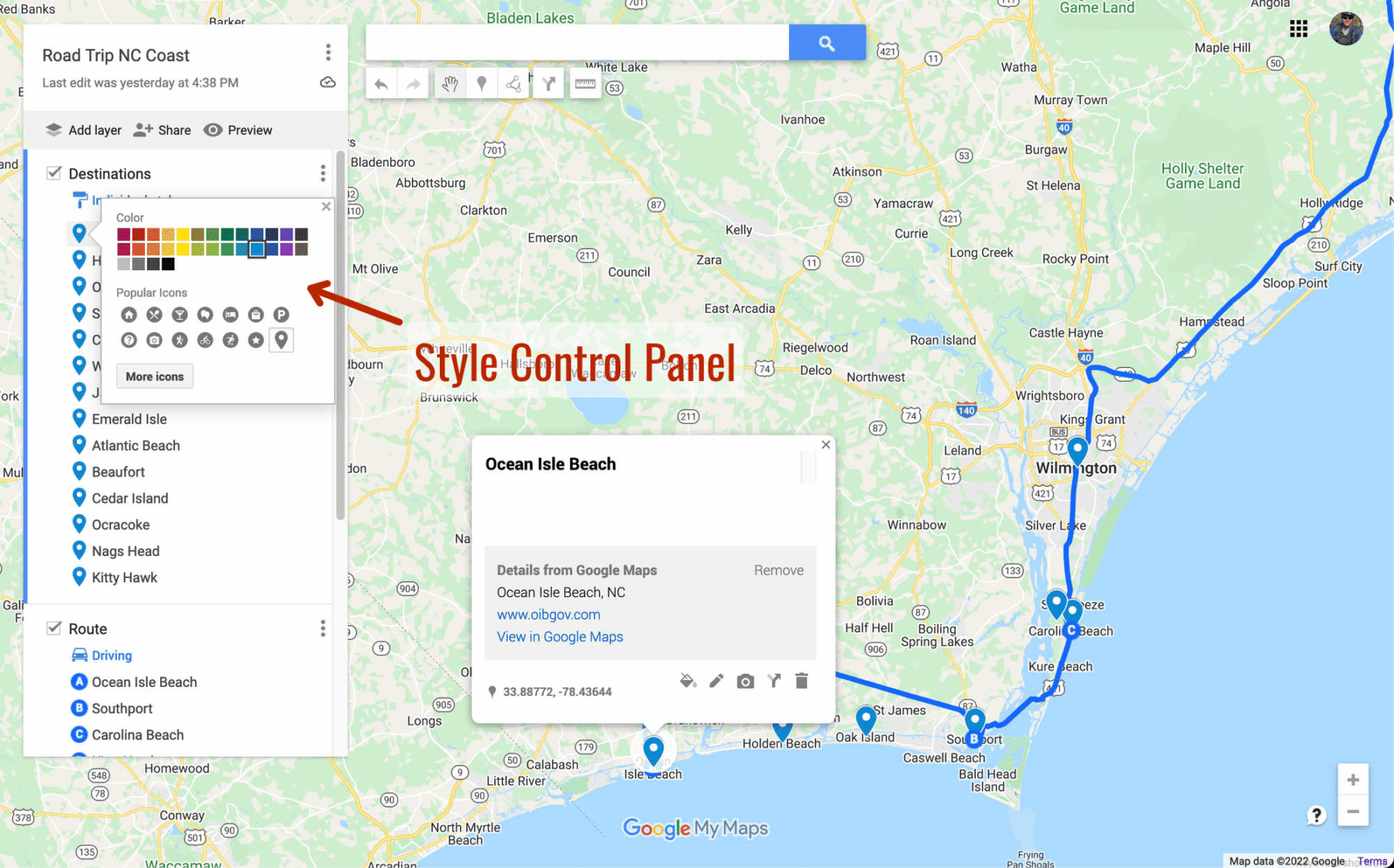 After adding a route and dozens – perhaps hundreds – of markers, the data can be overwhelming to view on a single map. This is where Google My Maps differs the most from Google Maps: the ability to stylize the markers.