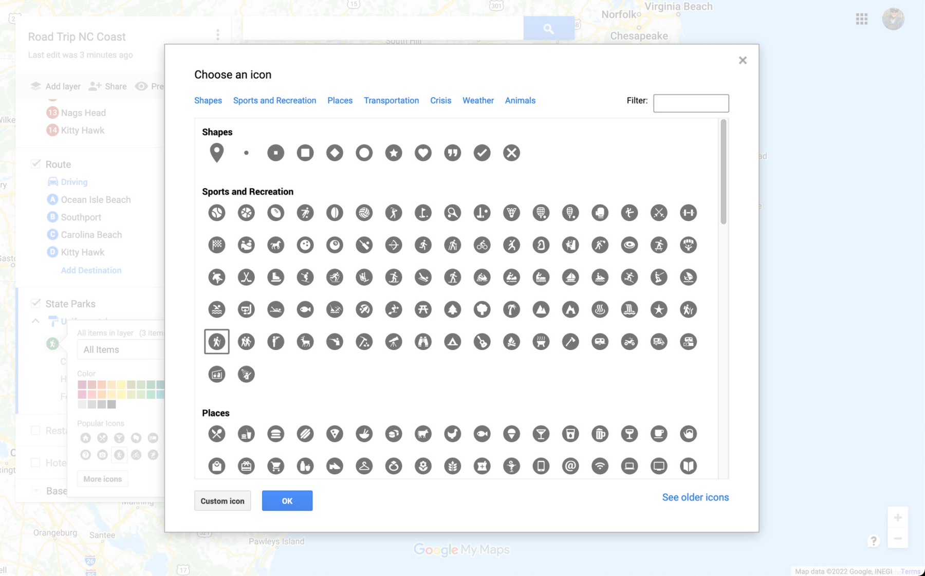 After clicking the edit button for any marker, a popup menu shows a color palette and popular icons. Unfortunately, Google My Maps does not support custom colors. But with 30 colors to choose from, you’re certain to find something that will work for your road trip.