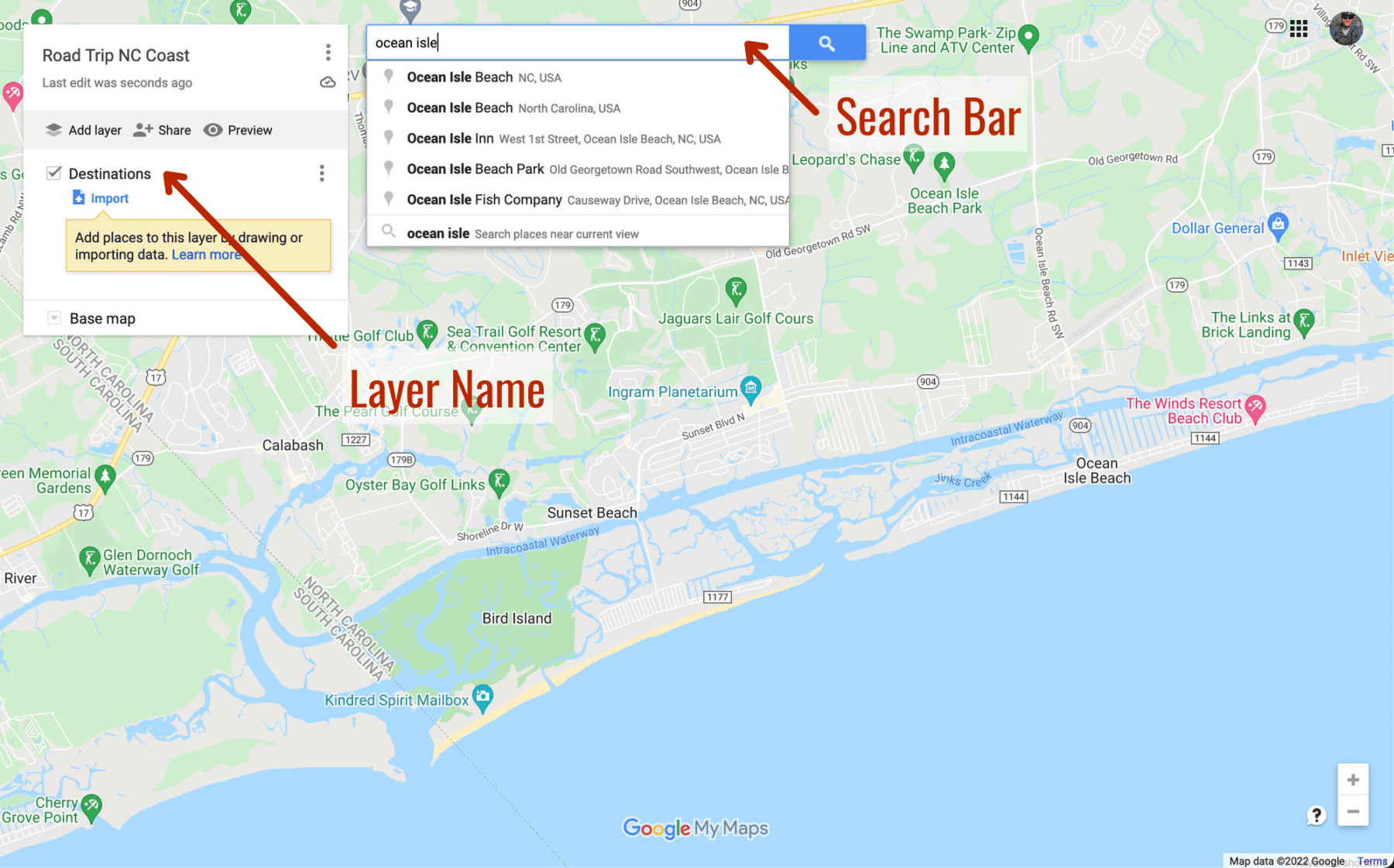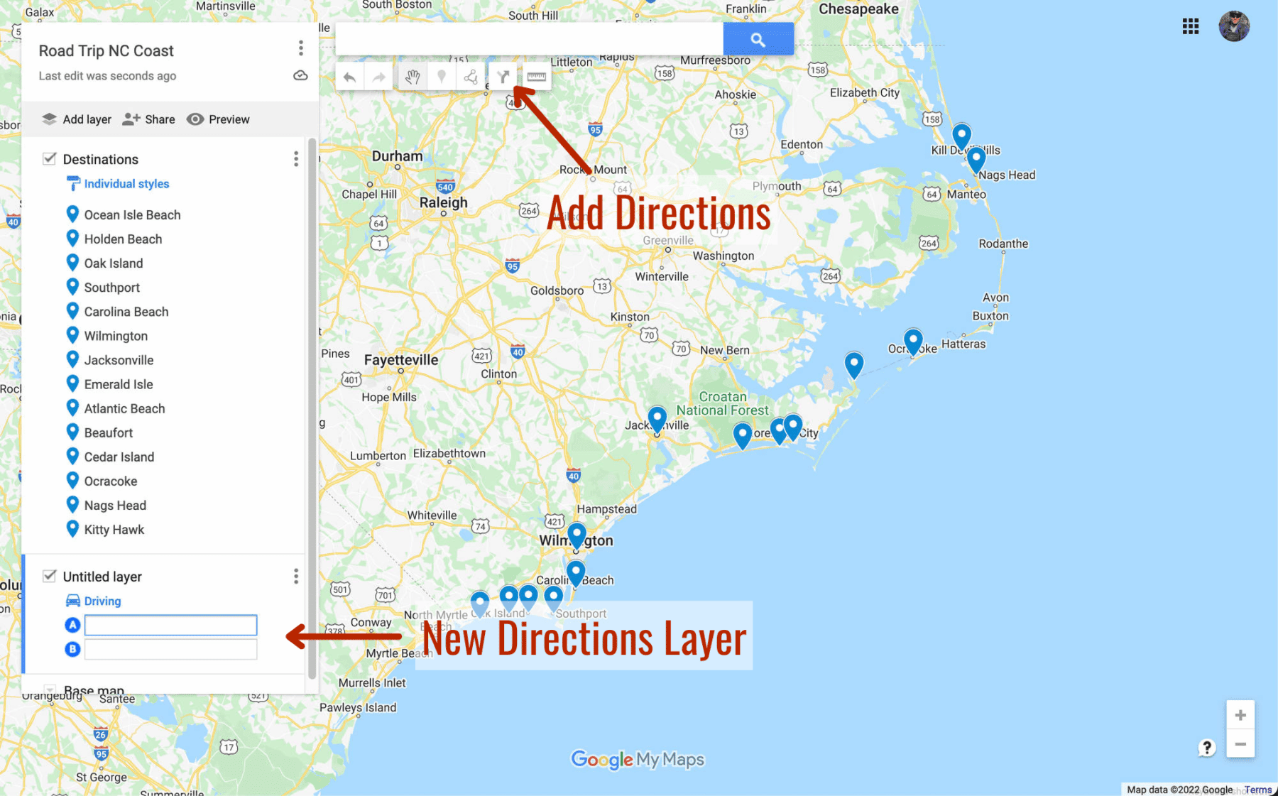 Using the search bar, search for the name of the destination. It can be a city or town, state or national park, or any type of business listed in Google Maps. Add each destination to the layer, and then drag the markers into the order you wish to visit them.