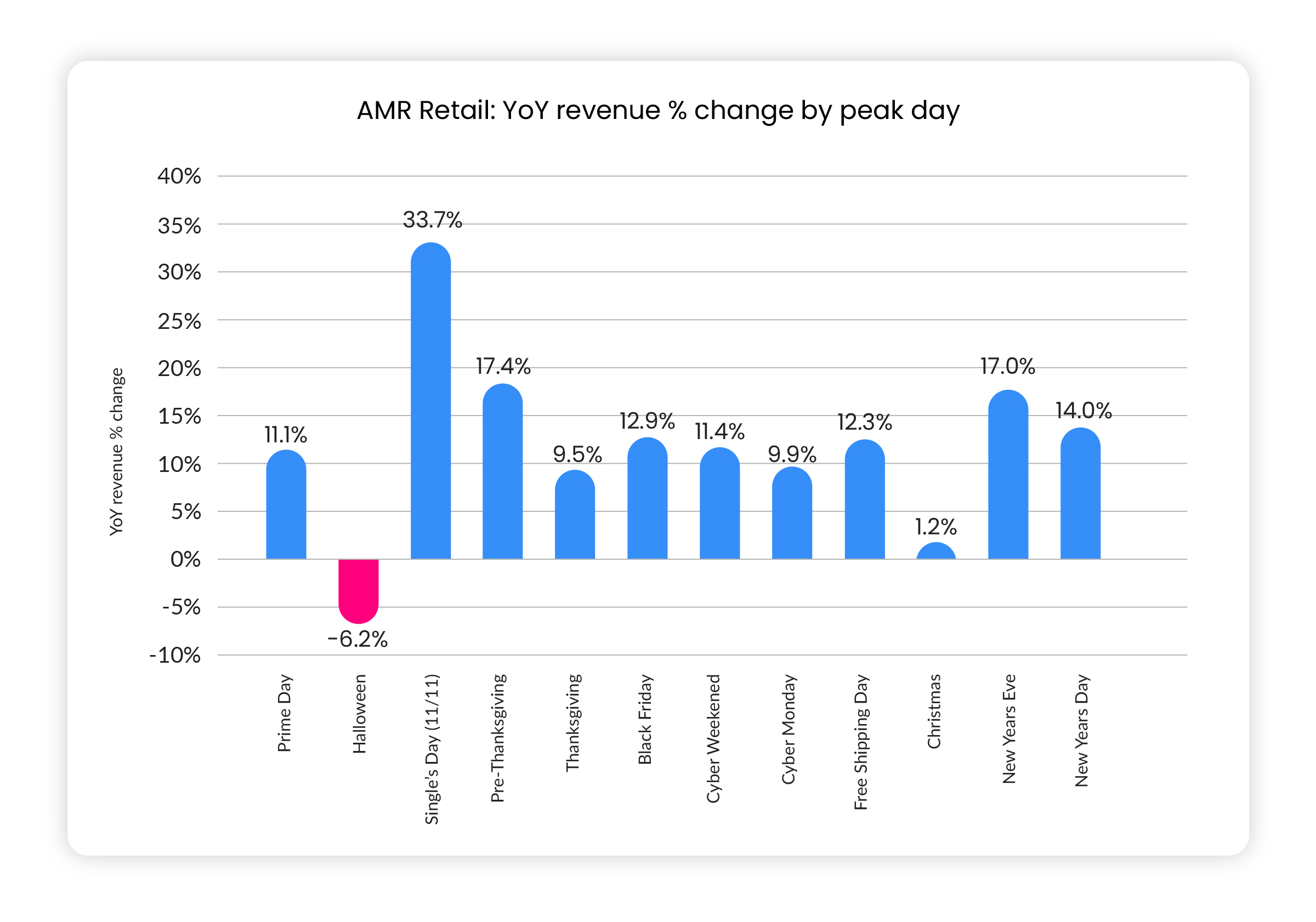 Performance across all key holidays in AMR was very strong (less Halloween). Standouts were Singles’ Day, the 7 days before Thanksgiving, and New Year’s Eve.